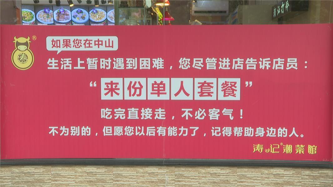 中山东区的涛记潮菜馆,则将“遇困可点单人套餐”直接写进告示。店主郑少涛要求店员不追问、不特殊对待,“让每位顾客都吃得自在”。